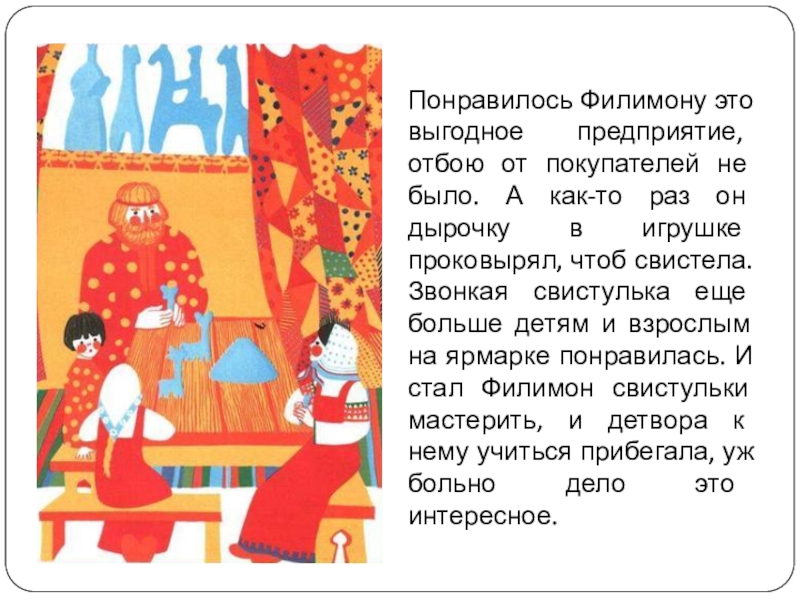 Звонкая свистулька еще больше детям и взрослым на ярмарке понравилась. И стал Филимон свистульки мастерить, и детвора к нему учиться прибегала, уж больно дело это интересное.