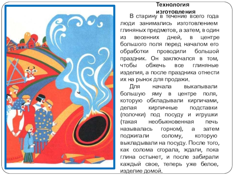 Для начала выкапывали большую яму в центре поля, которую обкладывали кирпичами, делая кирпичные подставки (полочки) под посуду и игрушки (такая необыкновенная печь называлась горном), а затем поджигали солому, которую выкладывали на посуду. После того, как солома сгорала, ждали, пока глина остынет, и после забирали каждый свое, теперь уже белое, изделие домой.