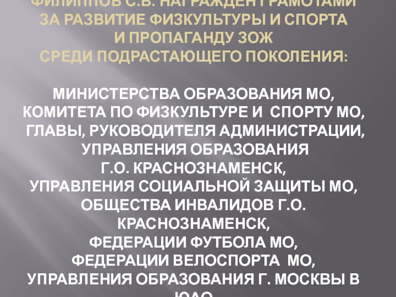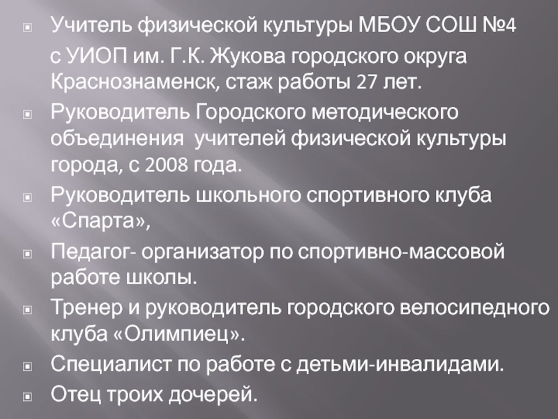 лет.Руководитель Городского методического объединения учителей физической культуры города, с 2008 года.