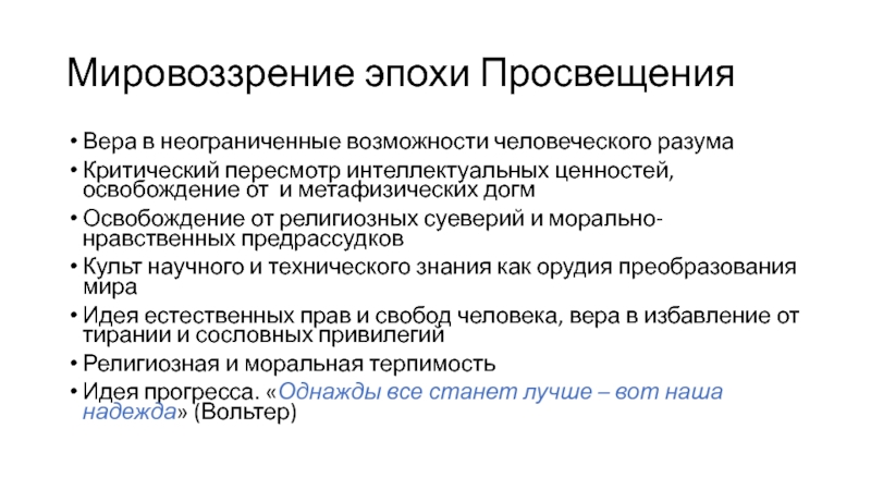 Идея естественных прав и свобод человека, вера в избавление от тирании и сословных привилегий