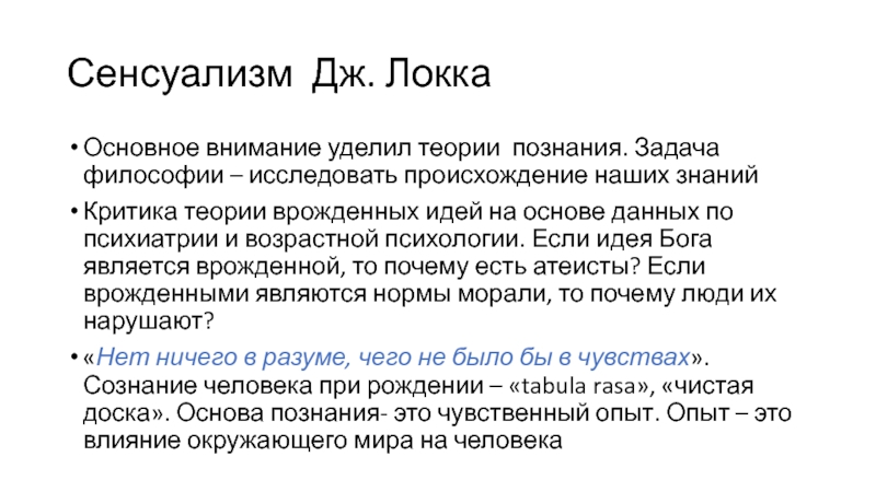 «Нет ничего в разуме, чего не было бы в чувствах». Сознание человека при рождении – «tabula rasa», «чистая доска». Основа познания- это чувственный опыт. Опыт – это влияние окружающего мира на человека