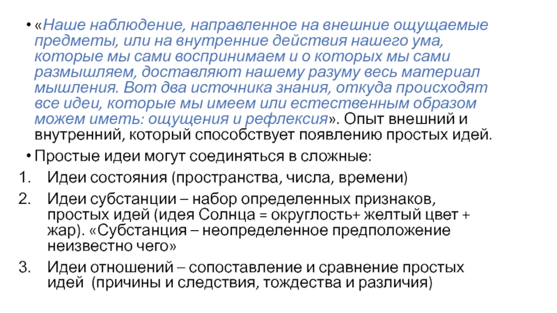 мы сами размышляем, доставляют нашему разуму весь материал мышления. Вот два источника знания, откуда происходят все идеи, которые мы имеем или естественным образом можем иметь: ощущения и рефлексия». Опыт внешний и внутренний, который способствует появлению простых идей.