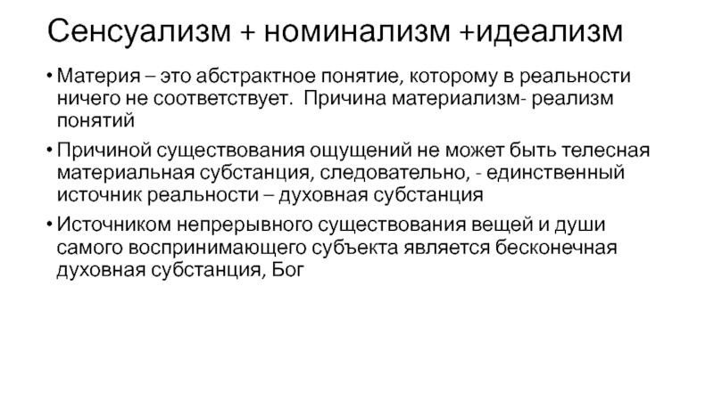 Отождествляет свойства вещей с ощущениями этих вещей. Единственная реальность – это ощущения в душе человека, вещь- это колебание наших ощущений или идей