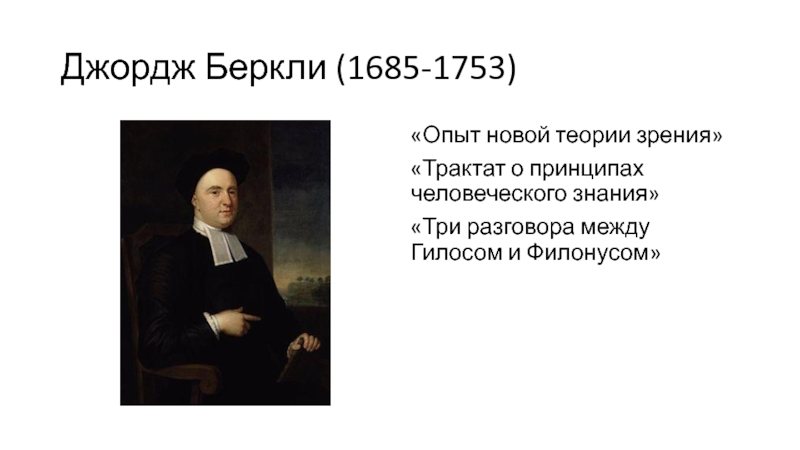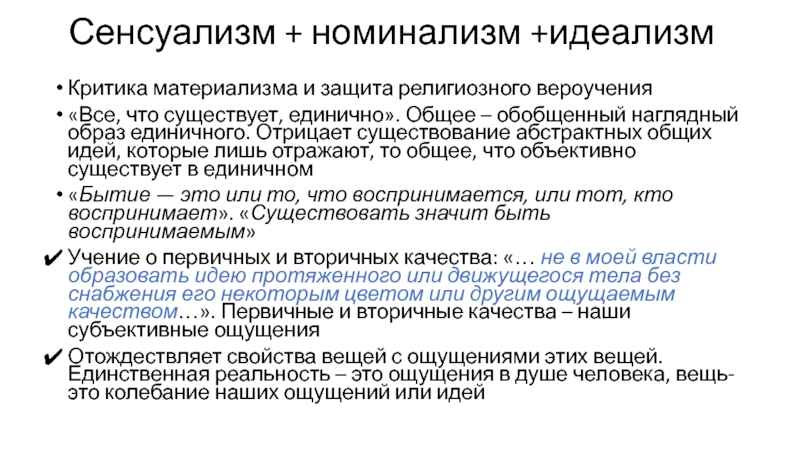 Учение о первичных и вторичных качества: «… не в моей власти образовать идею протяженного или движущегося тела без снабжения его некоторым цветом или другим ощущаемым качеством…». Первичные и вторичные качества – наши субъективные ощущения