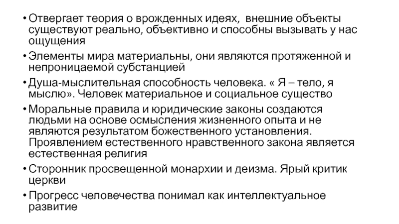 Слайд 14Отвергает теория о врожденных идеях, внешние объекты существуют реально, объективно