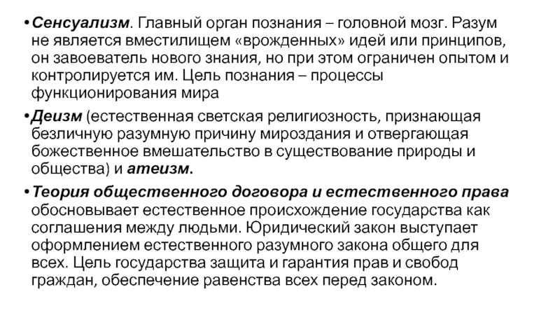 Слайд 5Сенсуализм. Главный орган познания – головной мозг. Разум не является