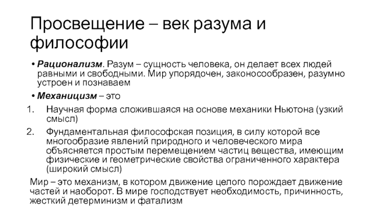 Мир – это механизм, в котором движение целого порождает движение частей и наоборот. В мире господствует необходимость, причинность, жесткий детерминизм и фатализм