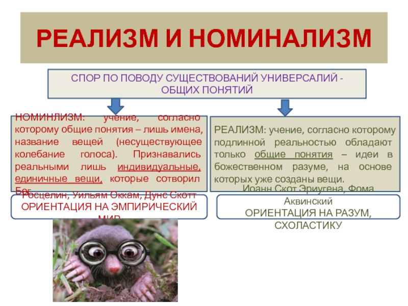 РЕАЛИЗМ: учение, согласно которому подлинной реальностью обладают только общие понятия – идеи в божественном разуме, на основе которых уже созданы вещи.