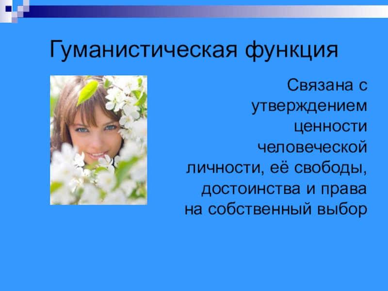 Слайд 43Гуманистическая функция
