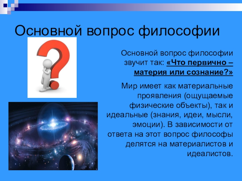 Основной вопрос философии. Основные направления философии.