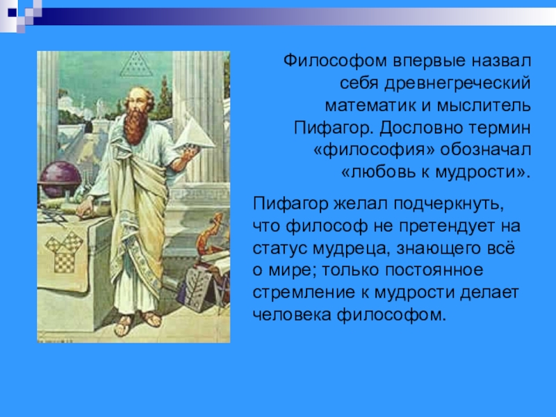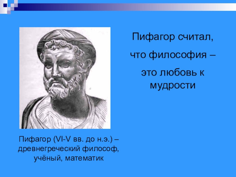 Слайд 9Пифагор (VI-V вв. до н.э.) – древнегреческий философ, учёный, математик