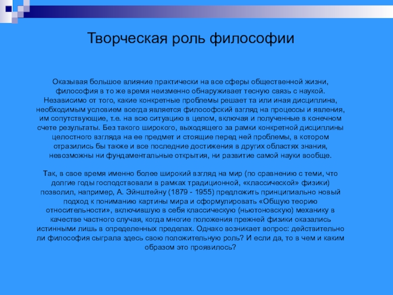 Так, в свое время именно более широкий взгляд на мир (по сравнению с теми, что долгие годы господствовали в рамках традиционной, «классической» физики) позволил, например, А. Эйнштейну (1879 - 1955) предложить принципиально новый подход к пониманию картины мира и сформулировать «Общую теорию относительности», включившую в себя классическую (ньютоновскую) механику в качестве частного случая, когда многие положения прежней физики оказались истинными лишь в определенных пределах. Однако возникает вопрос: действительно ли философия сыграла здесь свою положительную роль? И если да, то в чем и каким образом это проявилось?