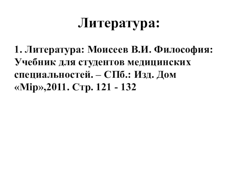 1. Литература: Моисеев В.И. Философия: Учебник для студентов медицинских специальностей.