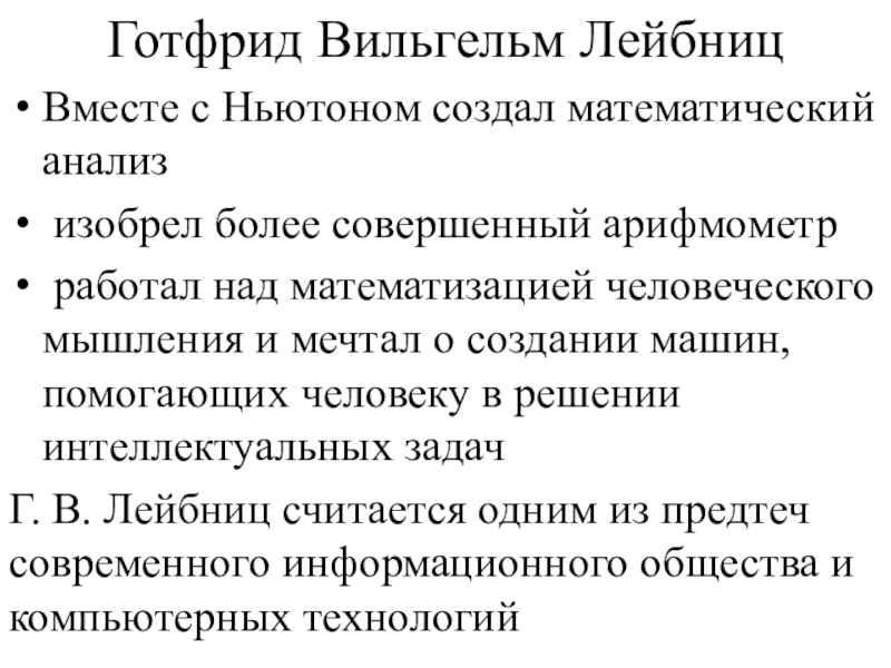 Г. В. Лейбниц считается одним из предтеч современного информационного общества и компьютерных технологий