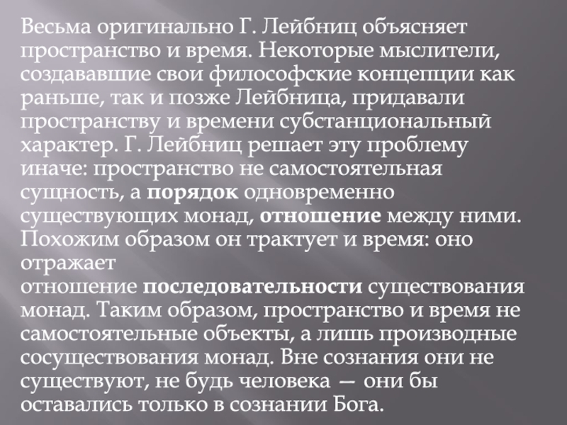 Слайд 25Весьма оригинально Г. Лейбниц объясняет пространство и время. Некоторые мыслители,
