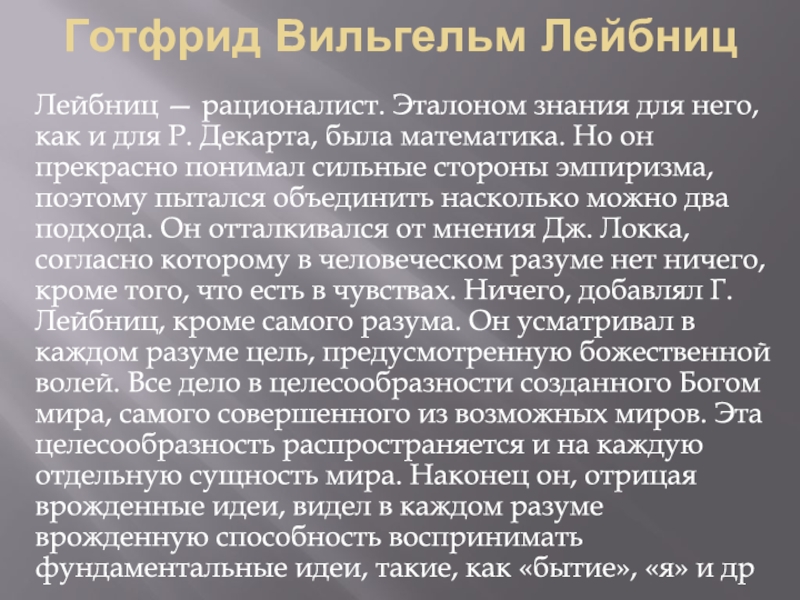 сильные стороны эмпиризма, поэтому пытался объединить насколько можно два подхода. Он отталкивался от мнения Дж. Локка, согласно которому в человеческом разуме нет ничего, кроме того, что есть в чувствах. Ничего, добавлял Г. Лейбниц, кроме самого разума. Он усматривал в каждом разуме цель, предусмотренную божественной волей. Все дело в целесообразности созданного Богом мира, самого совершенного из возможных миров. Эта целесообразность распространяется и на каждую отдельную сущность мира. Наконец он, отрицая врожденные идеи, видел в каждом разуме врожденную способность воспринимать фундаментальные идеи, такие, как «бытие», «я» и др