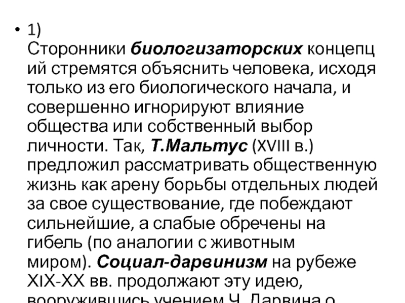 Слайд 41) Сторонники биологизаторских концепций стремятся объяснить человека, исходя только из его биологического