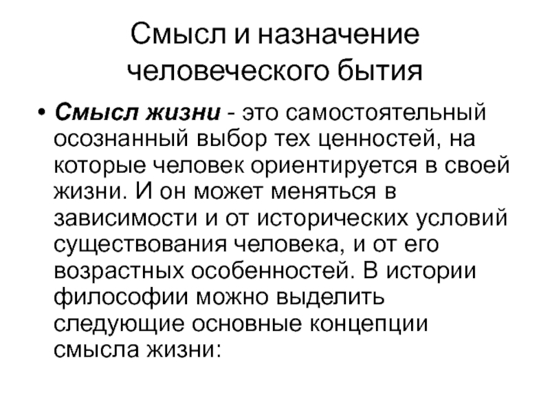он может меняться в зависимости и от исторических условий существования человека, и от его возрастных особенностей. В истории философии можно выделить следующие основные концепции смысла жизни: