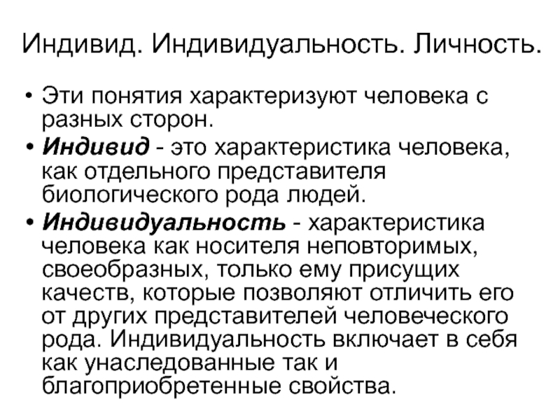 как носителя неповторимых, своеобразных, только ему присущих качеств, которые позволяют отличить его от других представителей человеческого рода. Индивидуальность включает в себя как унаследованные так и благоприобретенные свойства.