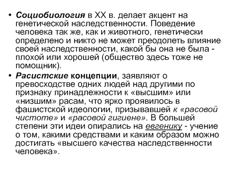 Слайд 5Социобиология в ХХ в. делает акцент на генетической наследственности. Поведение человека