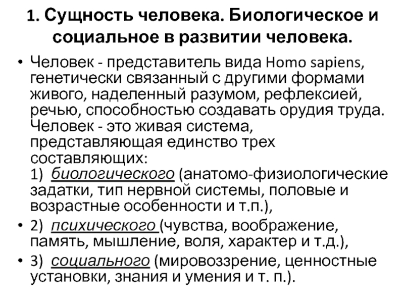 наделенный разумом, рефлексией, речью, способностью создавать орудия труда. Человек - это живая система, представляющая единство трех составляющих: