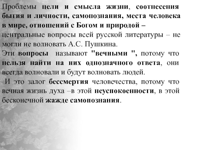 Слайд 18Лирические размышления Пушкина о смысле жизни и предназначении человека отражают
