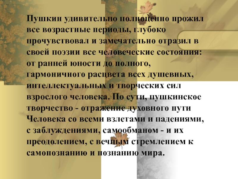 Пушкин удивительно полноценно прожил все возрастные периоды, глубоко прочувствовал и