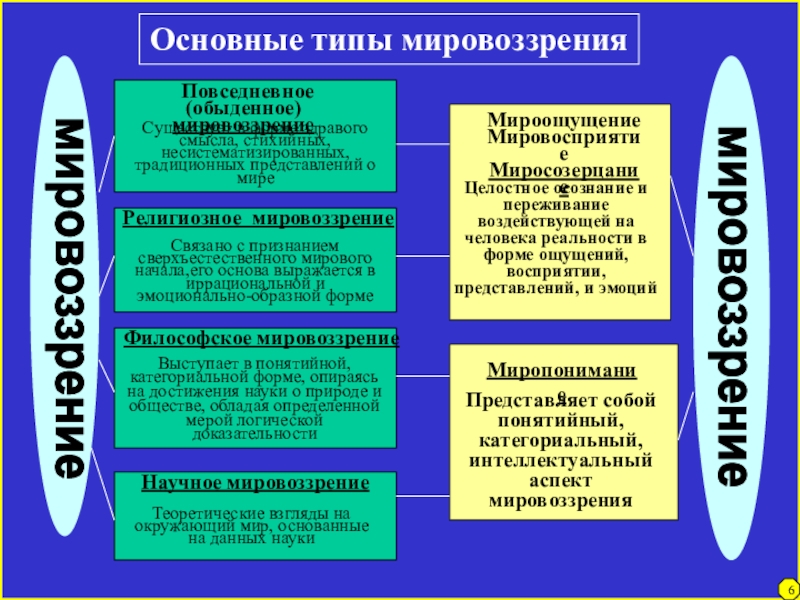 отношение человека к окружающей его действительности и самому себе, а также обусловленные этими взглядами основные жизненные позиции людей, их убеждения, идеалы, принципы познания и деятельности, ценностные ориентации