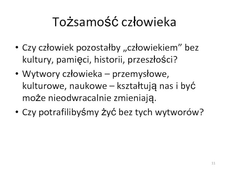 Tożsamość człowiekaCzy człowiek pozostałby „człowiekiem” bez kultury, pamięci, historii, przeszłości?Wytwory człowieka – przemysłowe, kulturowe, naukowe – kształtują