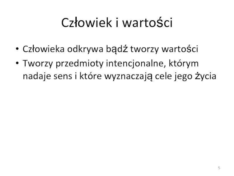 Człowiek i wartościCzłowieka odkrywa bądź tworzy wartościTworzy przedmioty intencjonalne, którym nadaje sens i które wyznaczają cele jego