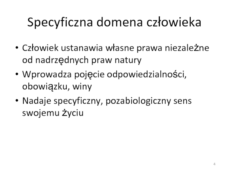 Specyficzna domena człowiekaCzłowiek ustanawia własne prawa niezależne od nadrzędnych praw naturyWprowadza pojęcie odpowiedzialności, obowiązku, winyNadaje specyficzny, pozabiologiczny