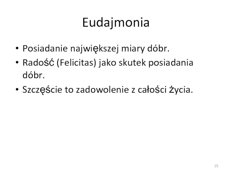 EudajmoniaPosiadanie największej miary dóbr. Radość (Felicitas) jako skutek posiadania dóbr. Szczęście to zadowolenie z całości życia.