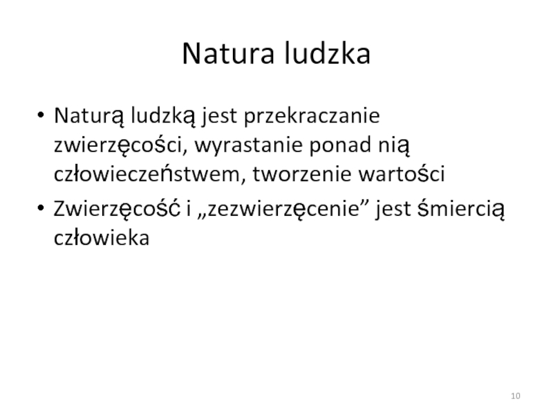 Natura ludzkaNaturą ludzką jest przekraczanie zwierzęcości, wyrastanie ponad nią człowieczeństwem, tworzenie wartościZwierzęcość i „zezwierzęcenie” jest śmiercią człowieka