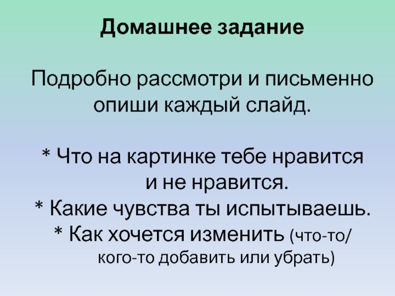 Домашнее задание  Подробно рассмотри и письменно опиши каждый слайд.   * Что на картинке тебе