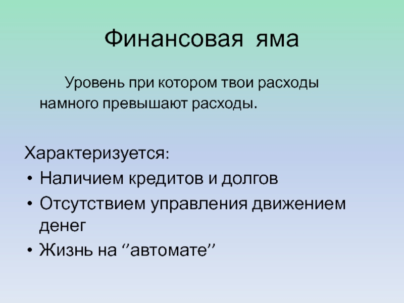 Финансовая яма Уровень при котором твои расходы намного превышают расходы.Характеризуется:Наличием кредитов и долговОтсутствием управления движением денегЖизнь на ‘’автомате’’