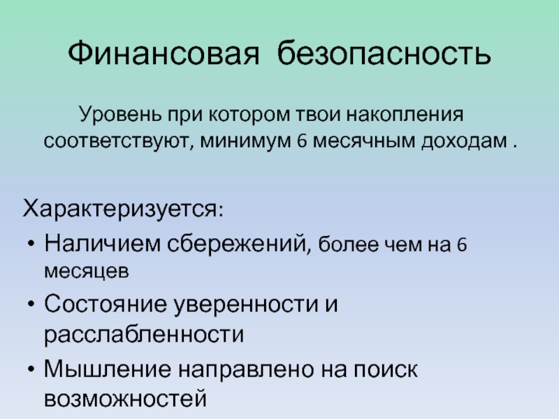 Финансовая безопасность		Уровень при котором твои накопления соответствуют, минимум 6 месячным доходам .Характеризуется:Наличием сбережений, более чем на 6