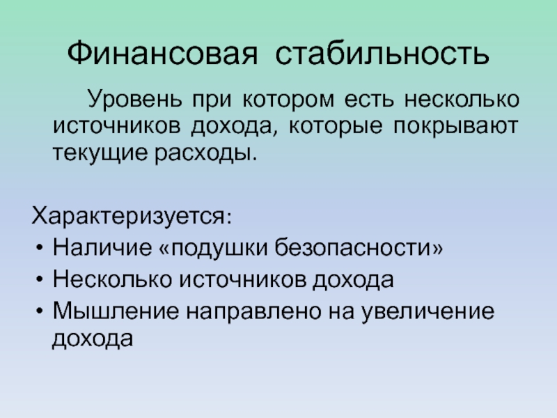 Финансовая стабильность		Уровень при котором есть несколько источников дохода, которые покрывают текущие расходы.Характеризуется:Наличие «подушки безопасности»Несколько источников доходаМышление направлено