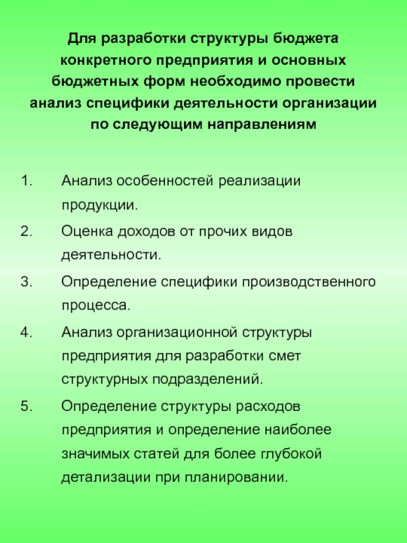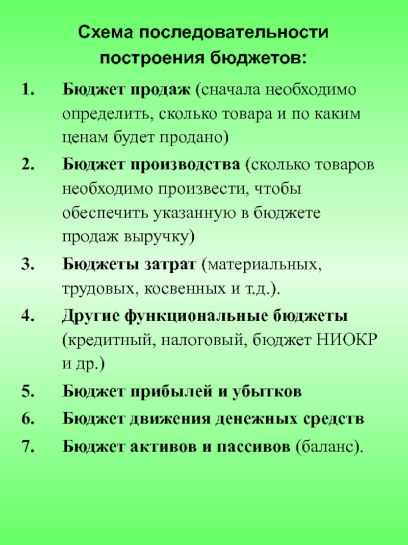 В зависимости от типа предприятия и особенностей его деятельности можно выделить следующие виды бюджетов: