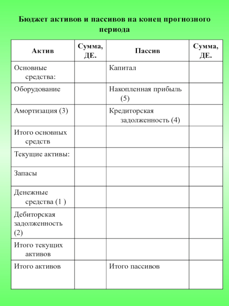 Слайд 25Бюджет активов и пассивов на конец прогнозного периода