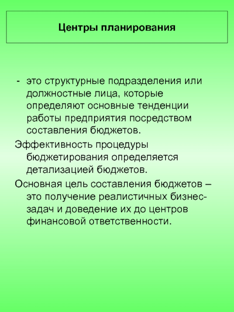 мероприятия по их выполнению, координирует деятельность центров планирования.