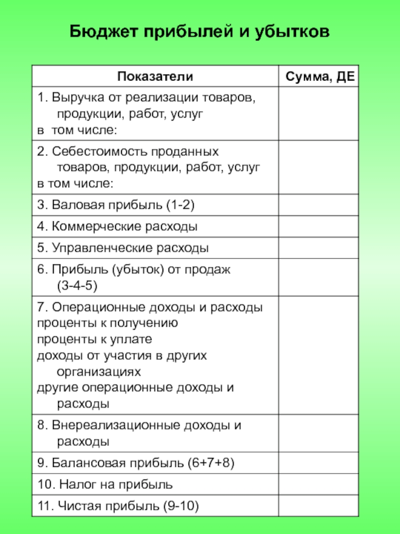 В бюджете продаж отражается информация о том, сколько каких товаров и по какой цене сможет продать фирма.