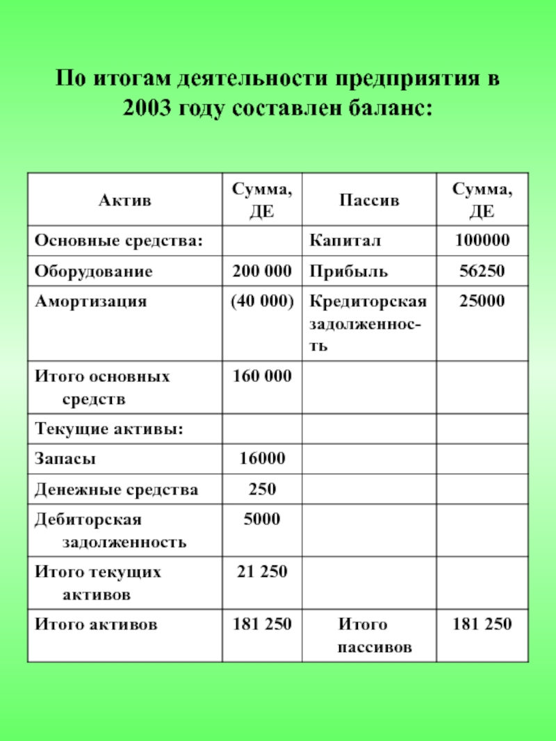 Слайд 36По итогам деятельности предприятия в 2003 году составлен баланс: