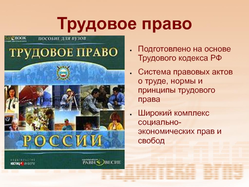 Трудовое правоДобавьте графический объект двойным щелчком мышиПодготовлено на основе Трудового кодекса РФСистема правовых актов о труде, нормы