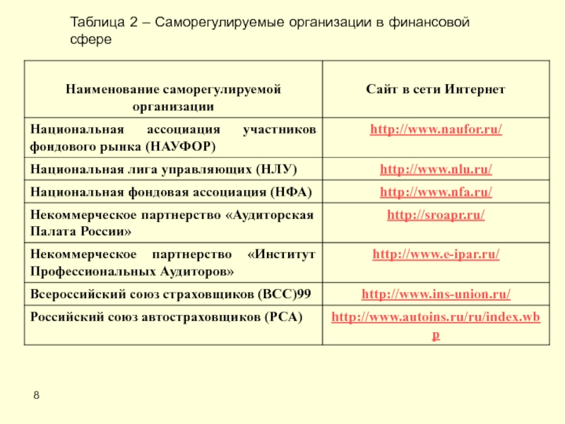 8Таблица 2 – Саморегулируемые организации в финансовой сфере