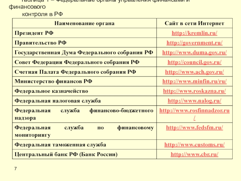 7Таблица 1 – Федеральные органы управления финансами и финансового контроля в РФ