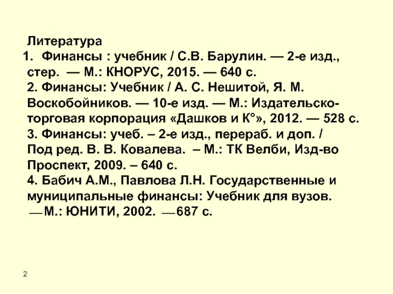 2ЛитератураФинансы : учебник / С.В. Барулин. — 2-е изд.,стер. — М.: КНОРУС, 2015. — 640 с.2. Финансы: