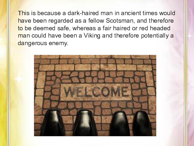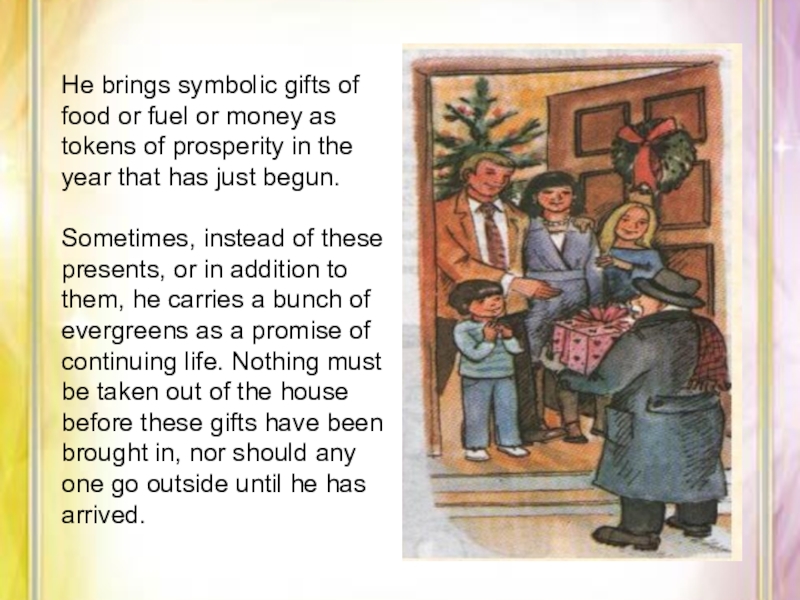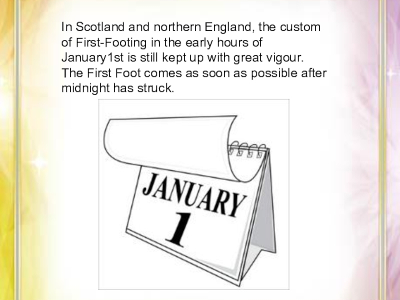 great vigour.The First Foot comes as soon as possible after midnight has struck.