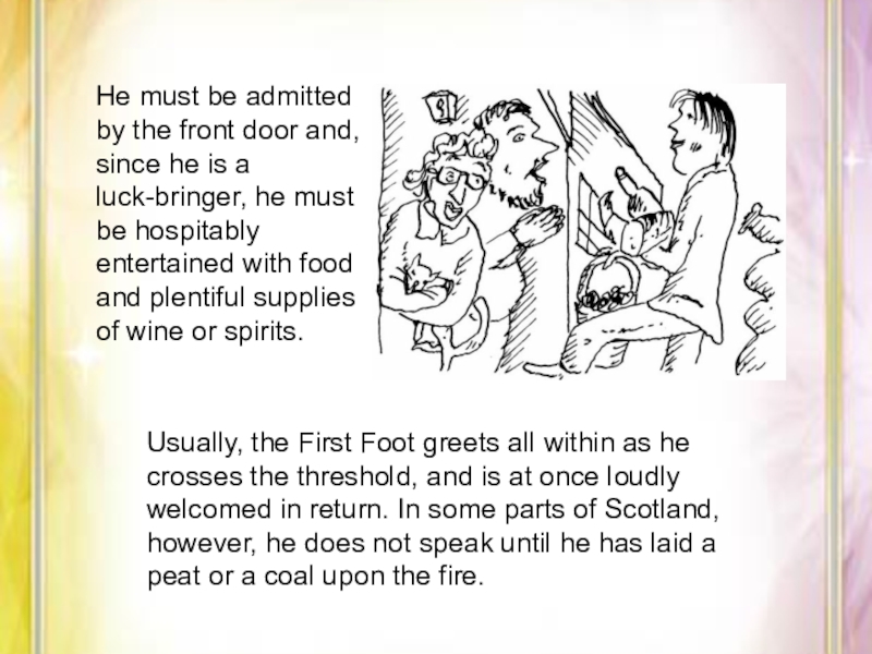 Usually, the First Foot greets all within as he crosses the threshold, and is at once loudly welcomed in return. In some parts of Scotland, however, he does not speak until he has laid a peat or a coal upon the fire.