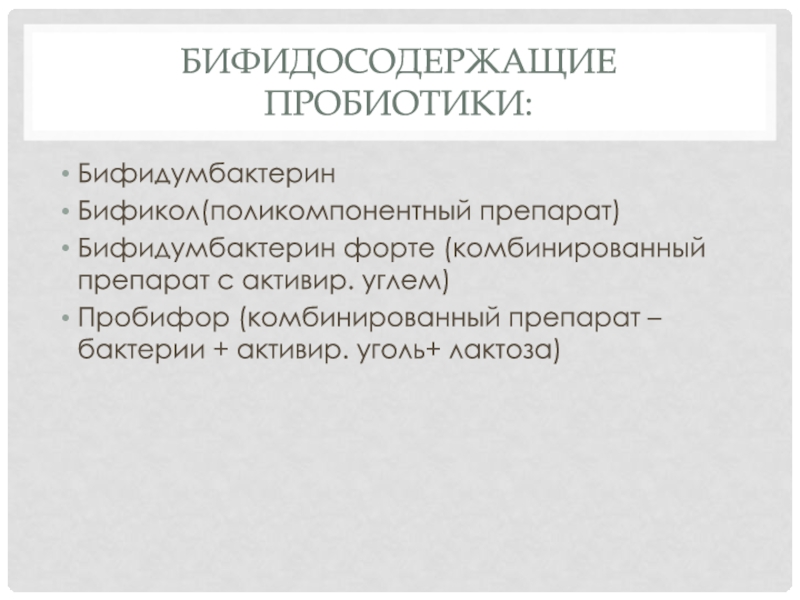 Бифидосодержащие пробиотики:БифидумбактеринБификол(поликомпонентный препарат)Бифидумбактерин форте (комбинированный препарат с активир. углем)Пробифор (комбинированный препарат –бактерии + активир. уголь+ лактоза)