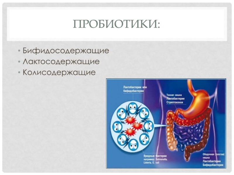 Пробиотики:БифидосодержащиеЛактосодержащиеКолисодержащие